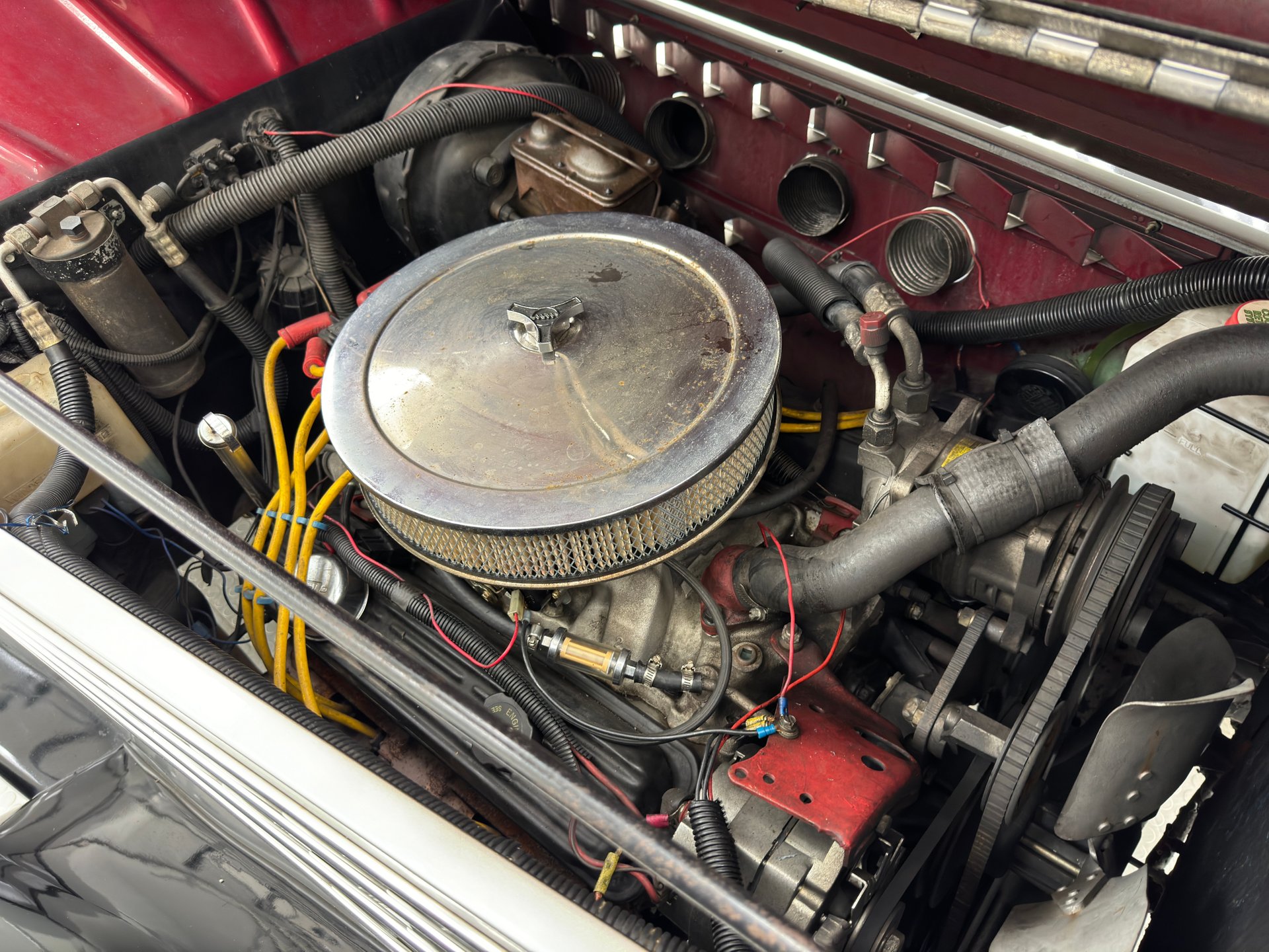 Transmission : Un V8 de 5,7 litres (350 ci) GM se cache sous le capot moteur. Il est équipé d'un carburateur quadruple corps et couplé à une boîte automatique TH350 à trois rapports. La puissance est transmise à l'essieu arrière à dix boulons. Le freinage est assuré par des freins à disques assistés à l'avant et des tambours assistés à l'arrière. Visuellement, le moteur est en bon état général, moins tape-à-l'œil que l'extérieur de la voiture.