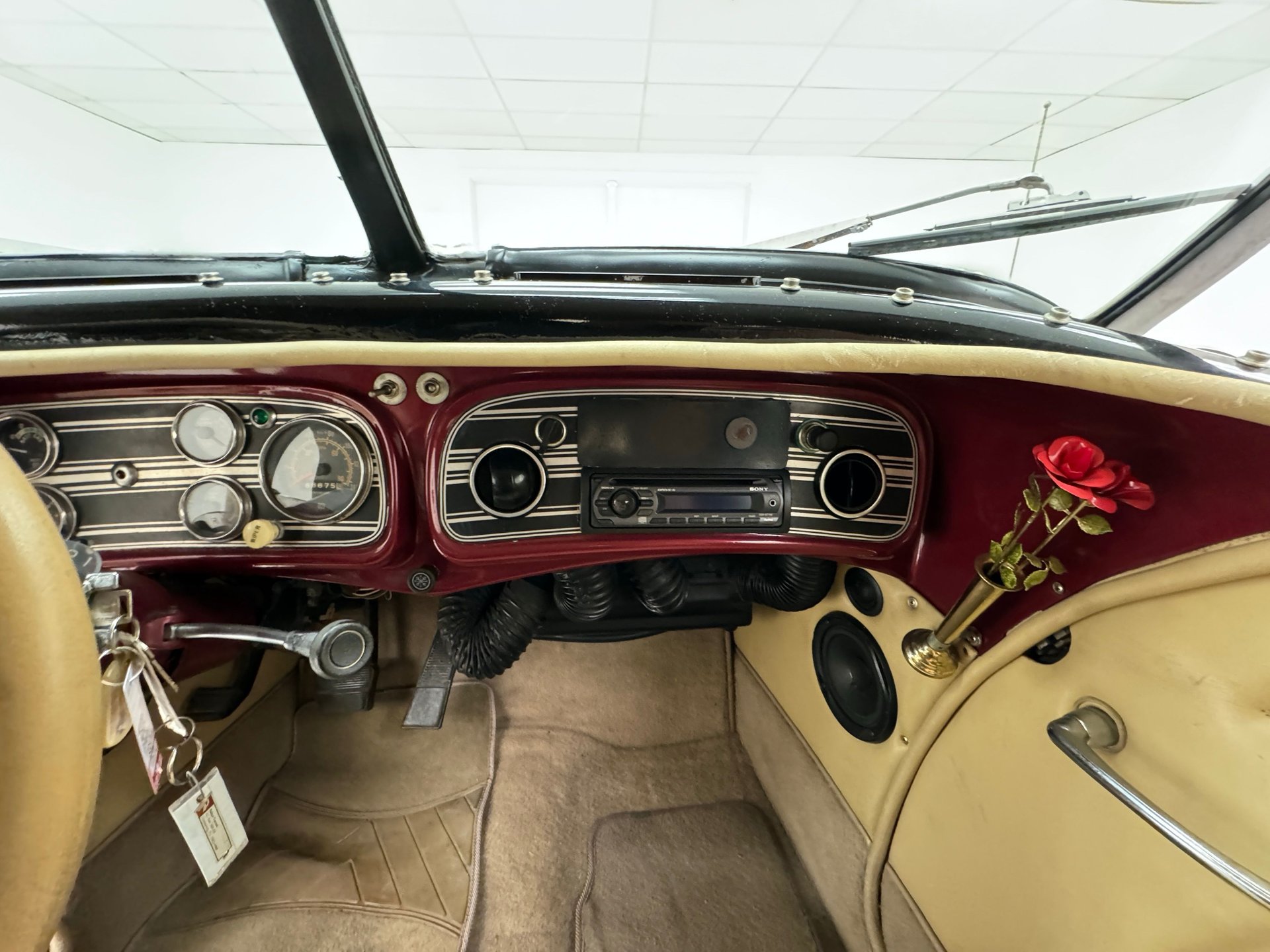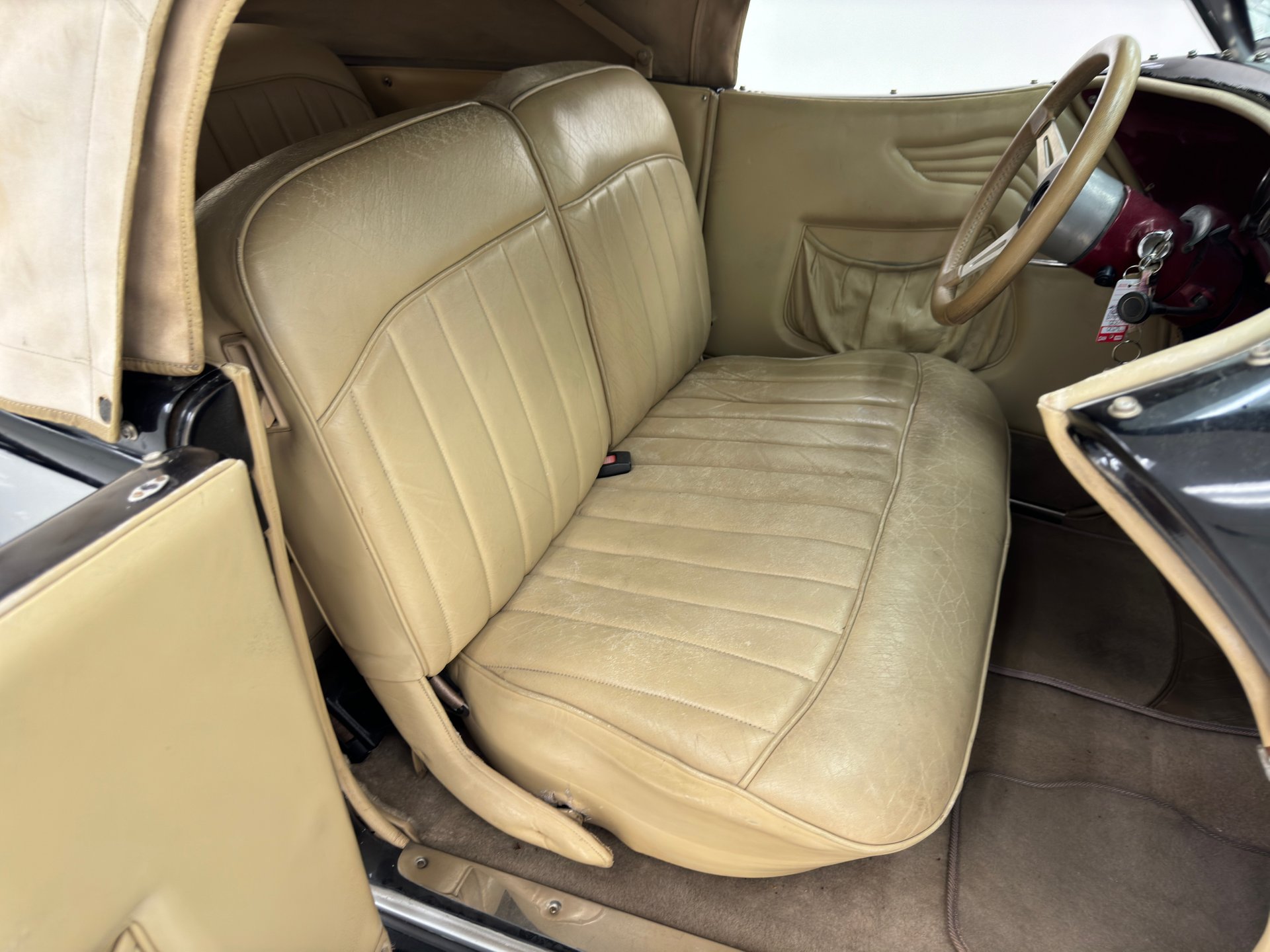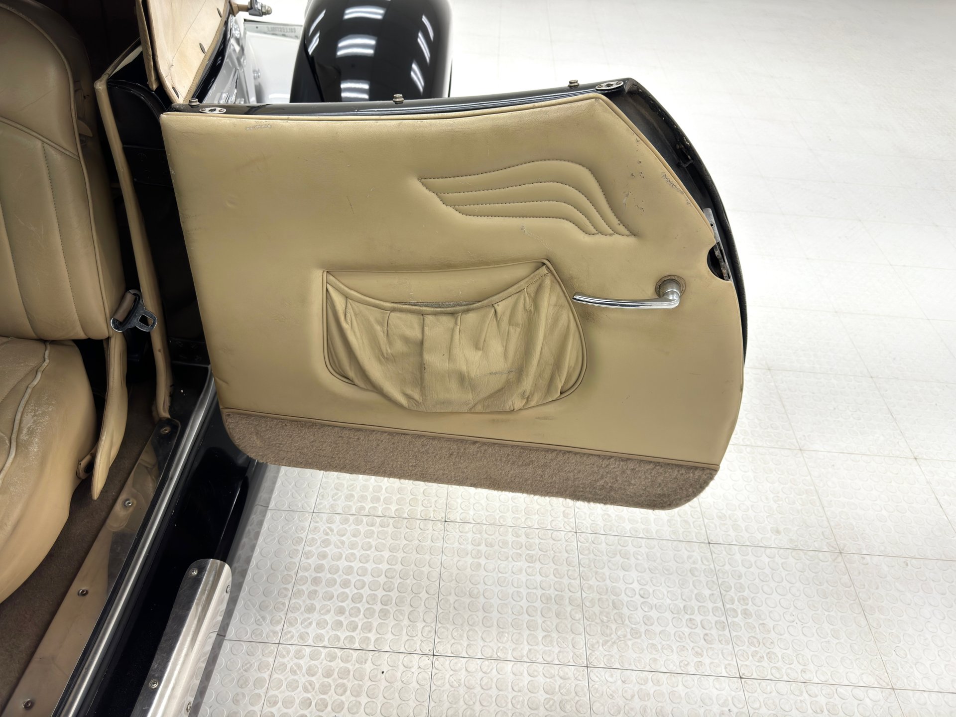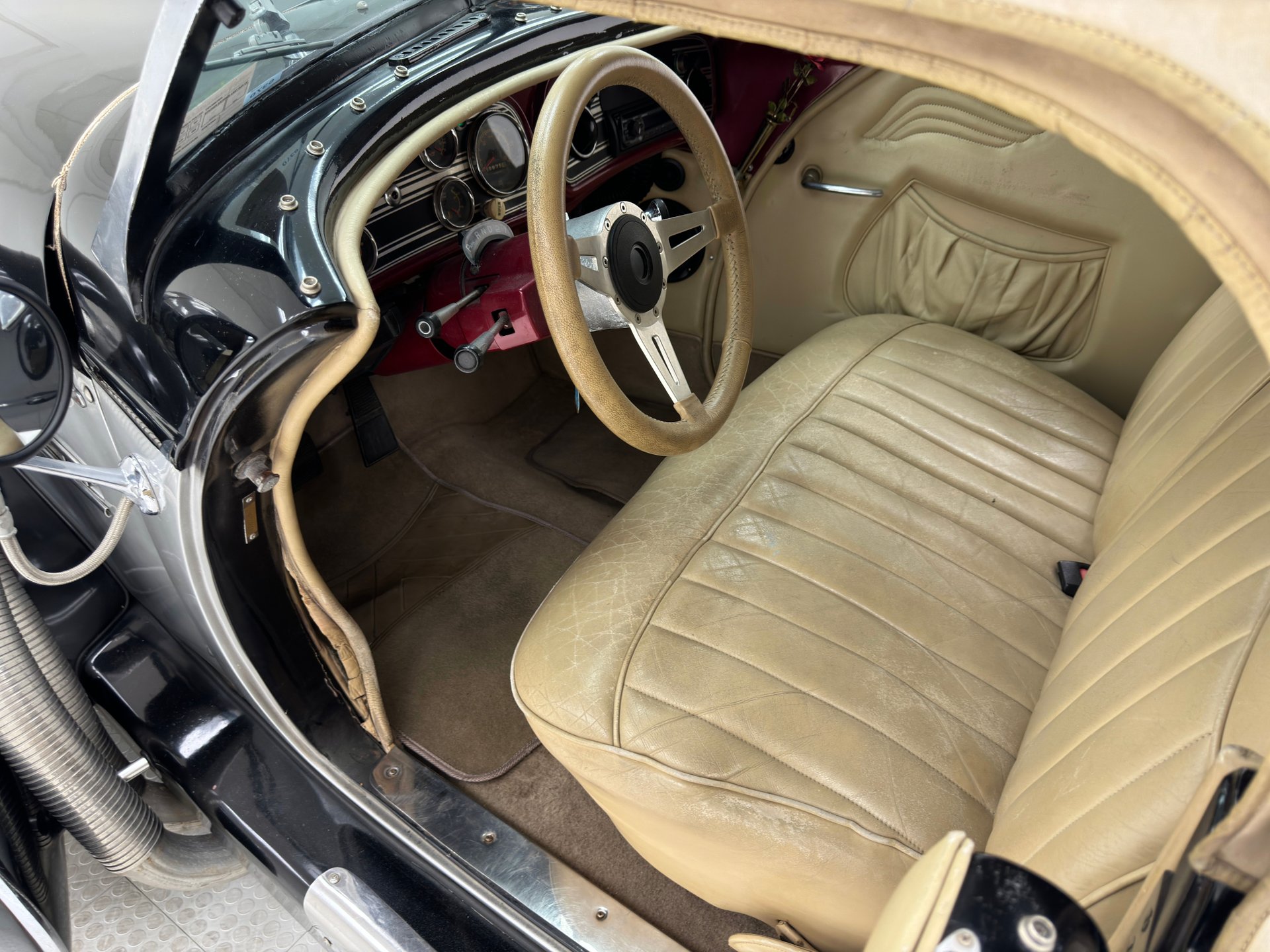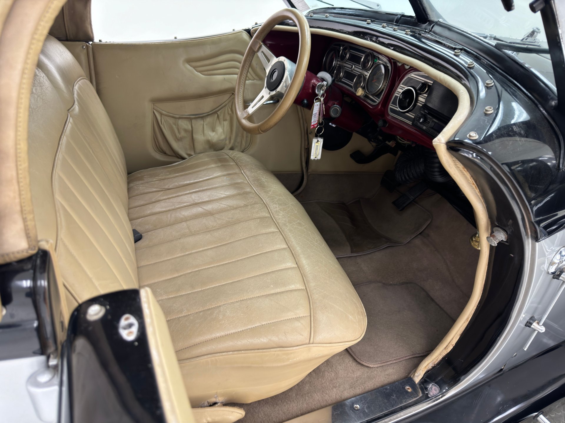 À l'intérieur, les panneaux de porte en cuir beige arborent un motif d'aile surpiqué et une poche plissée, ainsi qu'un actionneur permettant l'ouverture des portes antagoniste. La banquette arrière en cuir, divisée en deux parties, paraît plus moderne et présente quelques traces d'usure, normales pour une voiture ayant été utilisée et appréciée, mais aucune déchirure importante n'est visible. La banquette arrière, également en cuir beige surpiqué, est en meilleur état et dispose d'accoudoirs latéraux. Le volant, lui aussi gainé de cuir, porte les marques du temps, mais reste intact. Le levier de vitesses est au volant et donne accès à un tableau de bord à fond rouge, orné de motifs Art déco et de cadrans Stewart Warner qui semblent dater de la fin des années 1970. Côté passager, on trouve une radio AM/FM/CD et un vase à fleurs est fixé à droite. Le plancher est recouvert d'une moquette beige à poils courts, complétée par des tapis de sol. Des haut-parleurs sont intégrés au plancher. On remarque également que la garniture de porte côté conducteur se détache légèrement.