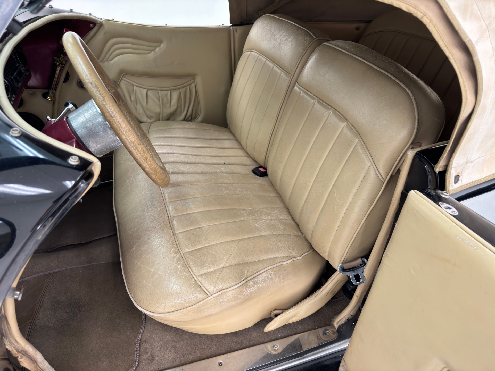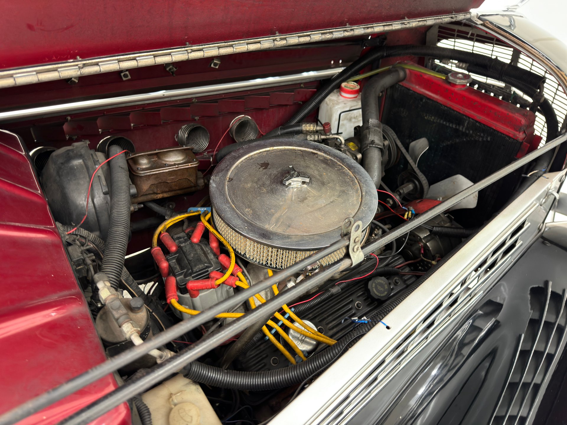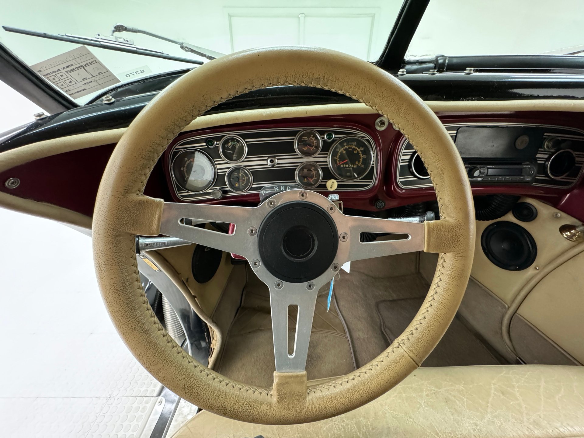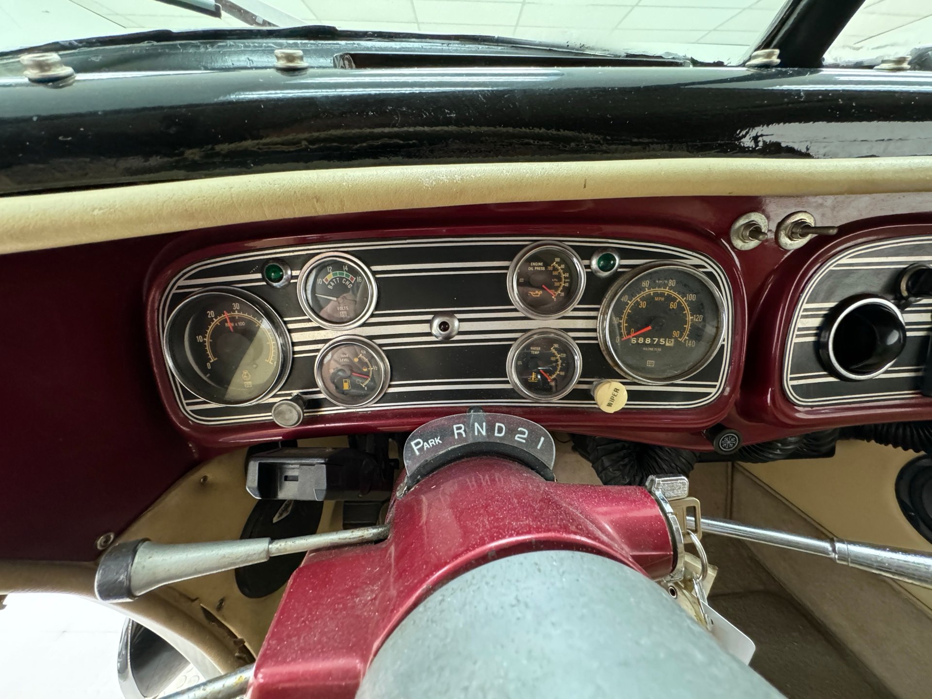 À l'intérieur, les panneaux de porte en cuir beige arborent un motif d'aile surpiqué et une poche plissée, ainsi qu'un actionneur permettant l'ouverture des portes antagoniste. La banquette arrière en cuir, divisée en deux parties, paraît plus moderne et présente quelques traces d'usure, normales pour une voiture ayant été utilisée et appréciée, mais aucune déchirure importante n'est visible. La banquette arrière, également en cuir beige surpiqué, est en meilleur état et dispose d'accoudoirs latéraux. Le volant, lui aussi gainé de cuir, porte les marques du temps, mais reste intact. Le levier de vitesses est au volant et donne accès à un tableau de bord à fond rouge, orné de motifs Art déco et de cadrans Stewart Warner qui semblent dater de la fin des années 1970. Côté passager, on trouve une radio AM/FM/CD et un vase à fleurs est fixé à droite. Le plancher est recouvert d'une moquette beige à poils courts, complétée par des tapis de sol. Des haut-parleurs sont intégrés au plancher. On remarque également que la garniture de porte côté conducteur se détache légèrement.