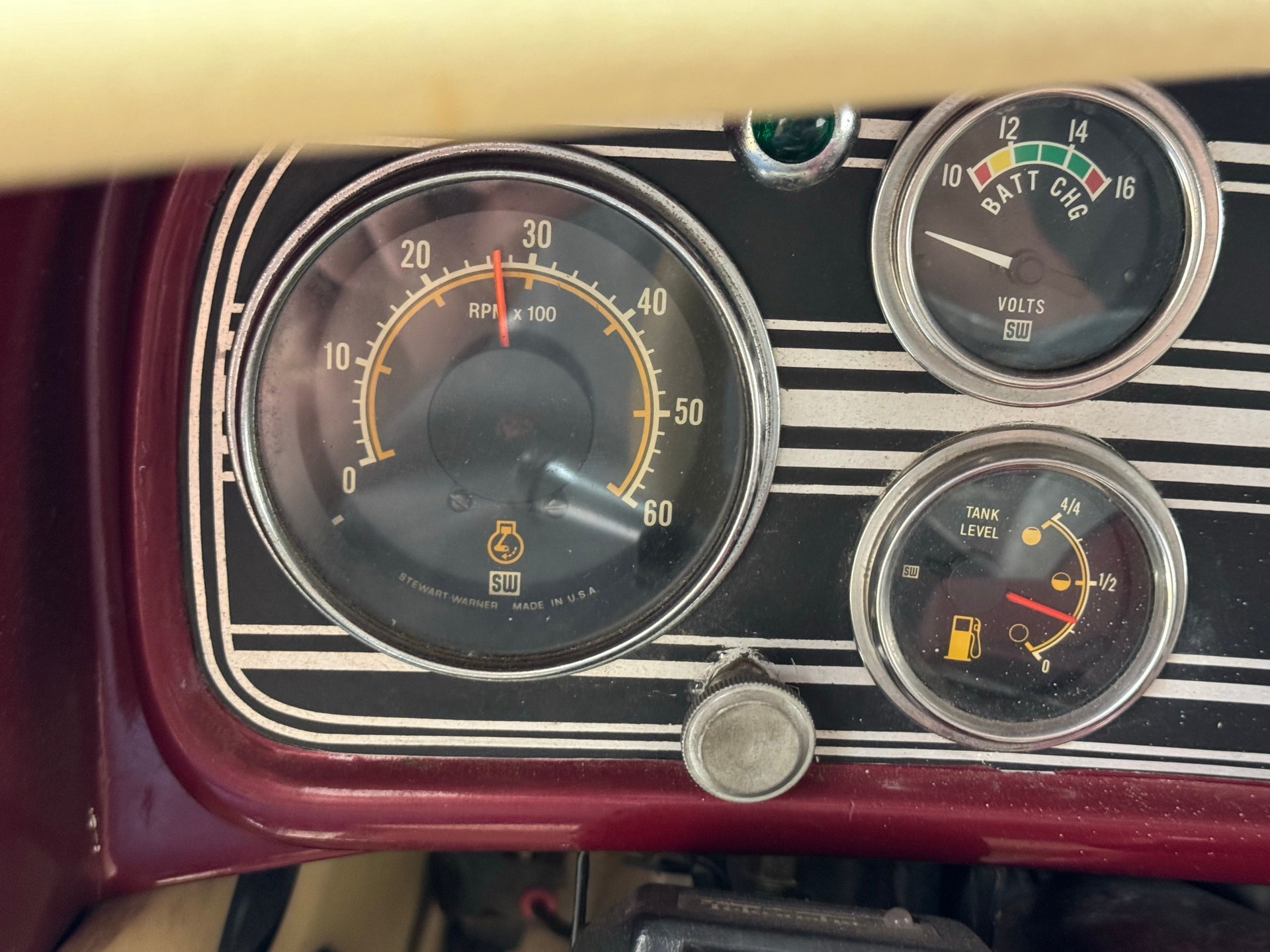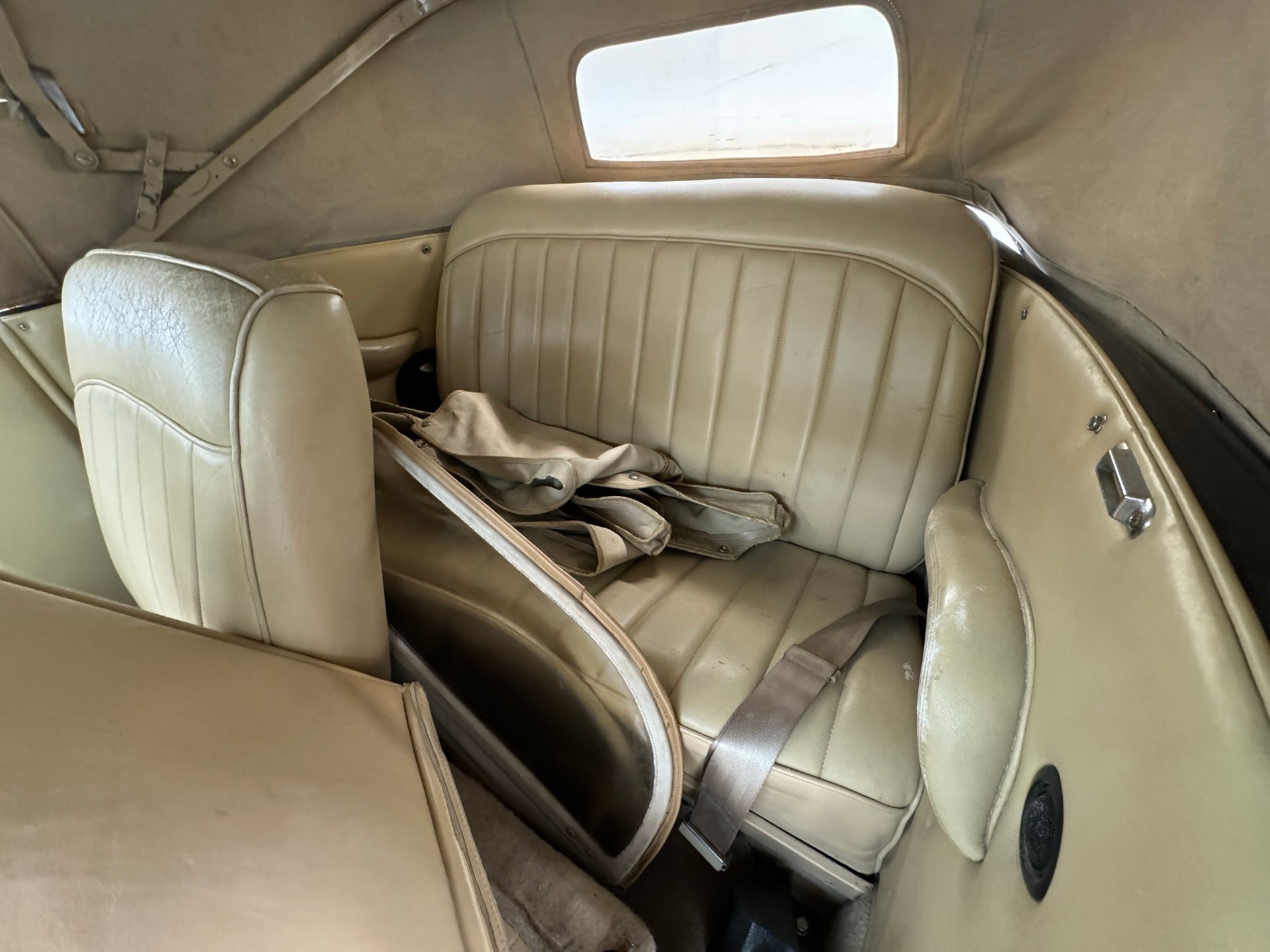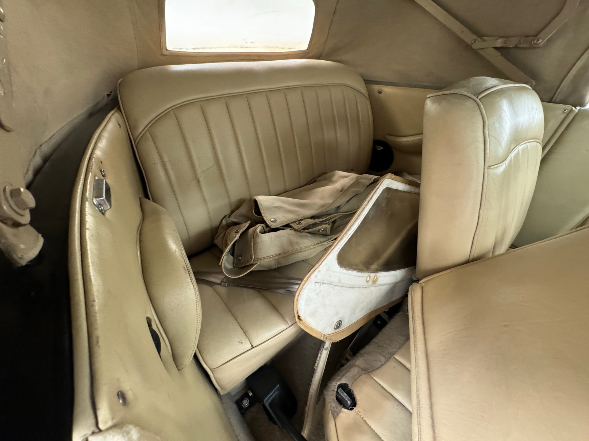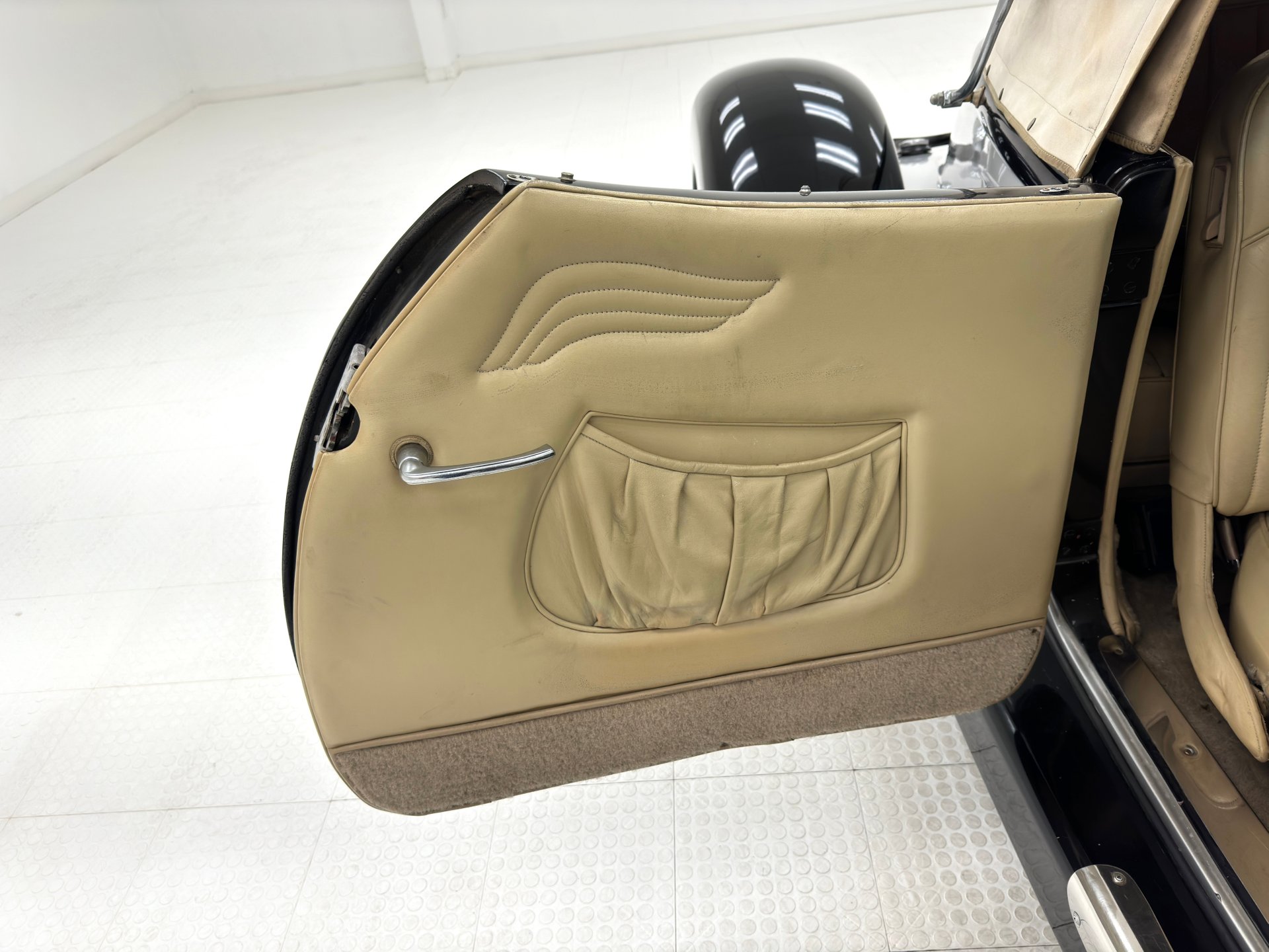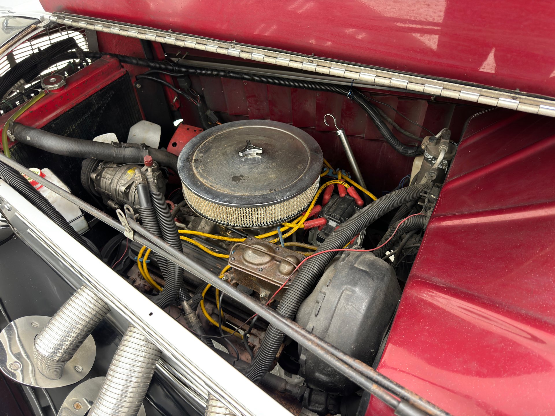 À l'intérieur, les panneaux de porte en cuir beige arborent un motif d'aile surpiqué et une poche plissée, ainsi qu'un actionneur permettant l'ouverture des portes antagoniste. La banquette arrière en cuir, divisée en deux parties, paraît plus moderne et présente quelques traces d'usure, normales pour une voiture ayant été utilisée et appréciée, mais aucune déchirure importante n'est visible. La banquette arrière, également en cuir beige surpiqué, est en meilleur état et dispose d'accoudoirs latéraux. Le volant, lui aussi gainé de cuir, porte les marques du temps, mais reste intact. Le levier de vitesses est au volant et donne accès à un tableau de bord à fond rouge, orné de motifs Art déco et de cadrans Stewart Warner qui semblent dater de la fin des années 1970. Côté passager, on trouve une radio AM/FM/CD et un vase à fleurs est fixé à droite. Le plancher est recouvert d'une moquette beige à poils courts, complétée par des tapis de sol. Des haut-parleurs sont intégrés au plancher. On remarque également que la garniture de porte côté conducteur se détache légèrement.
