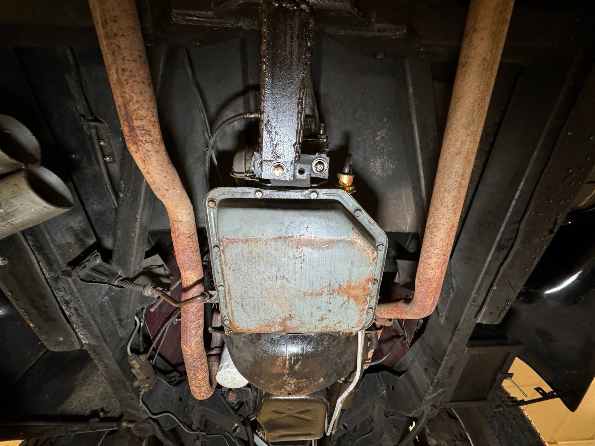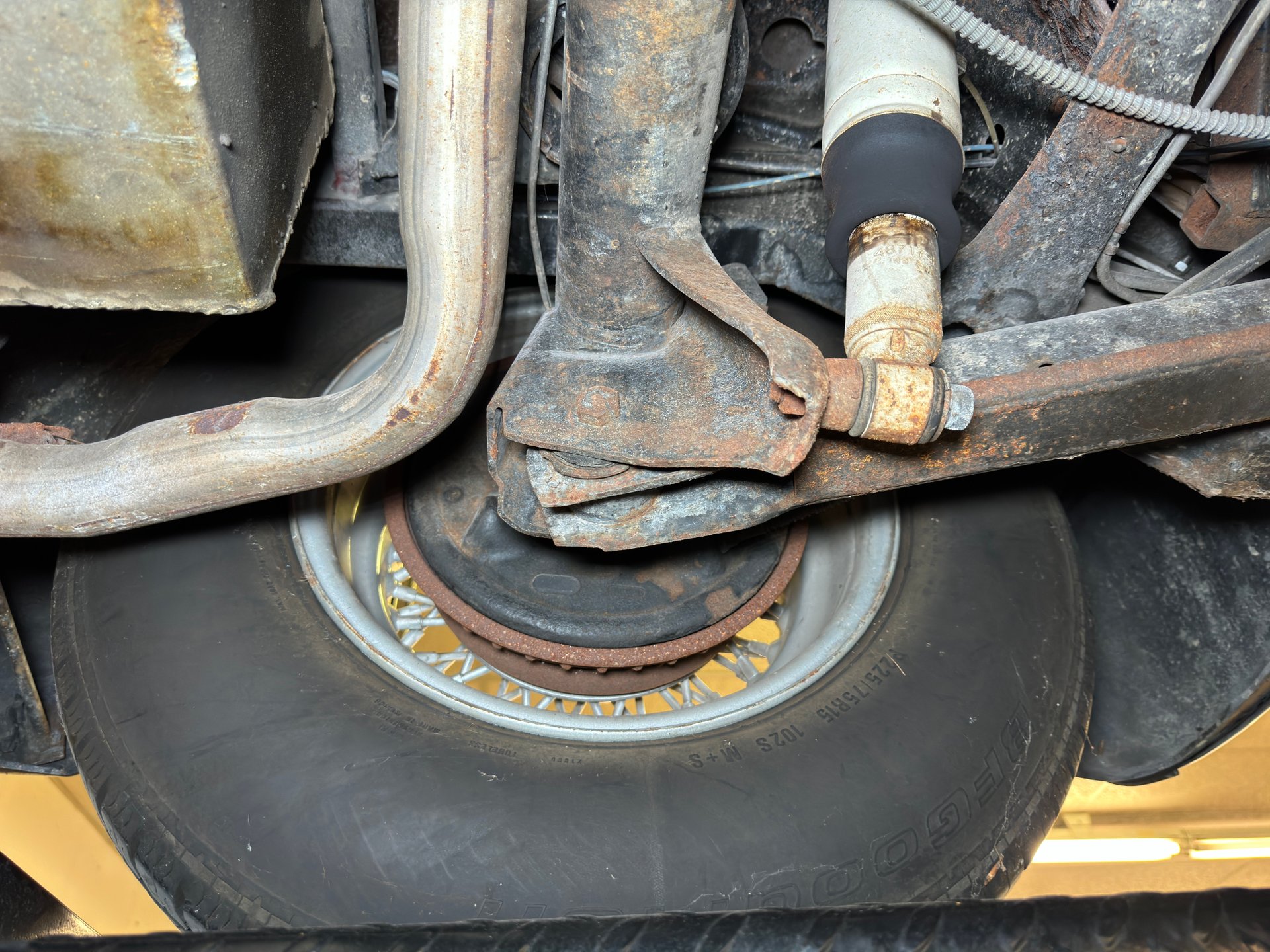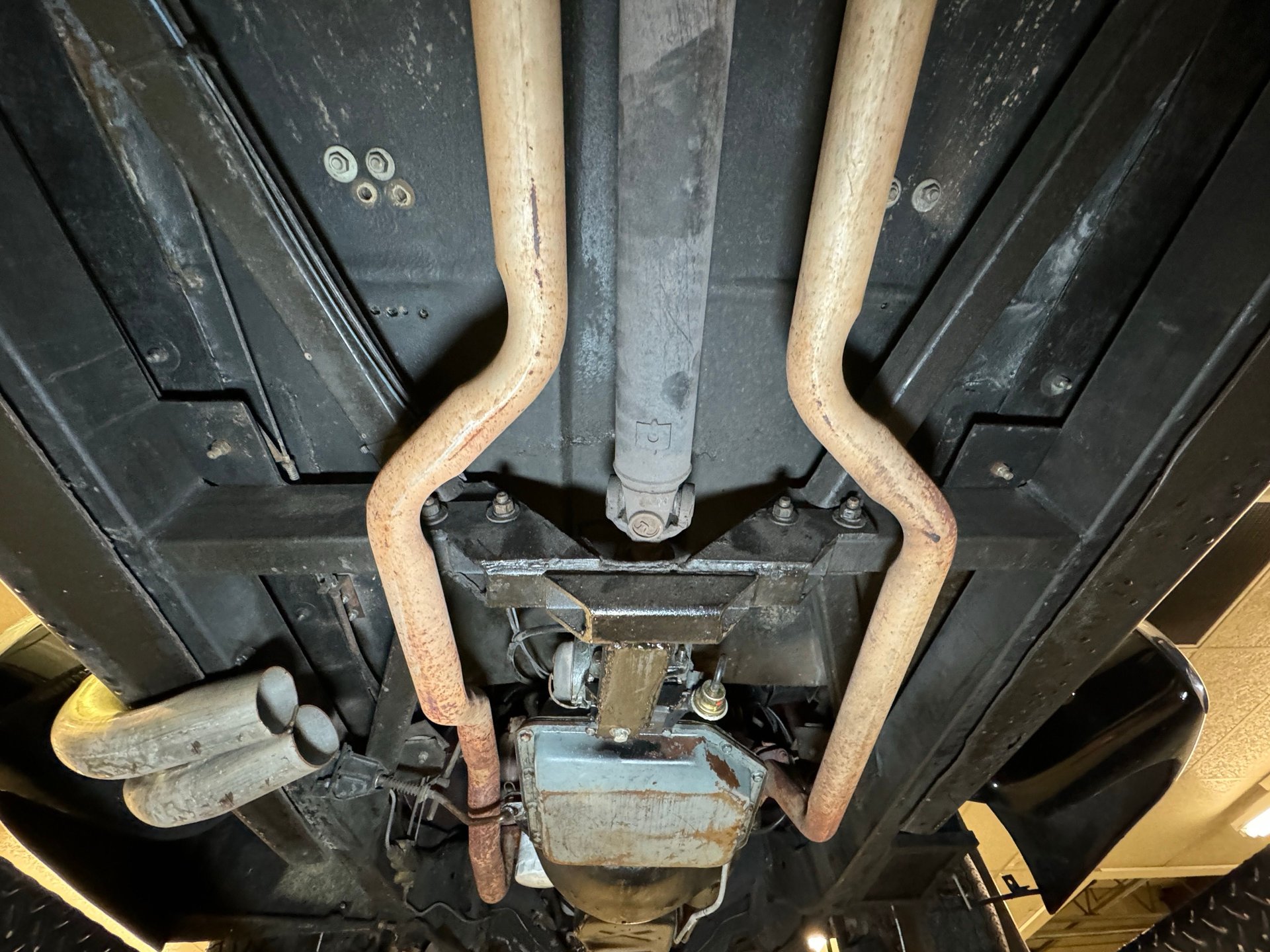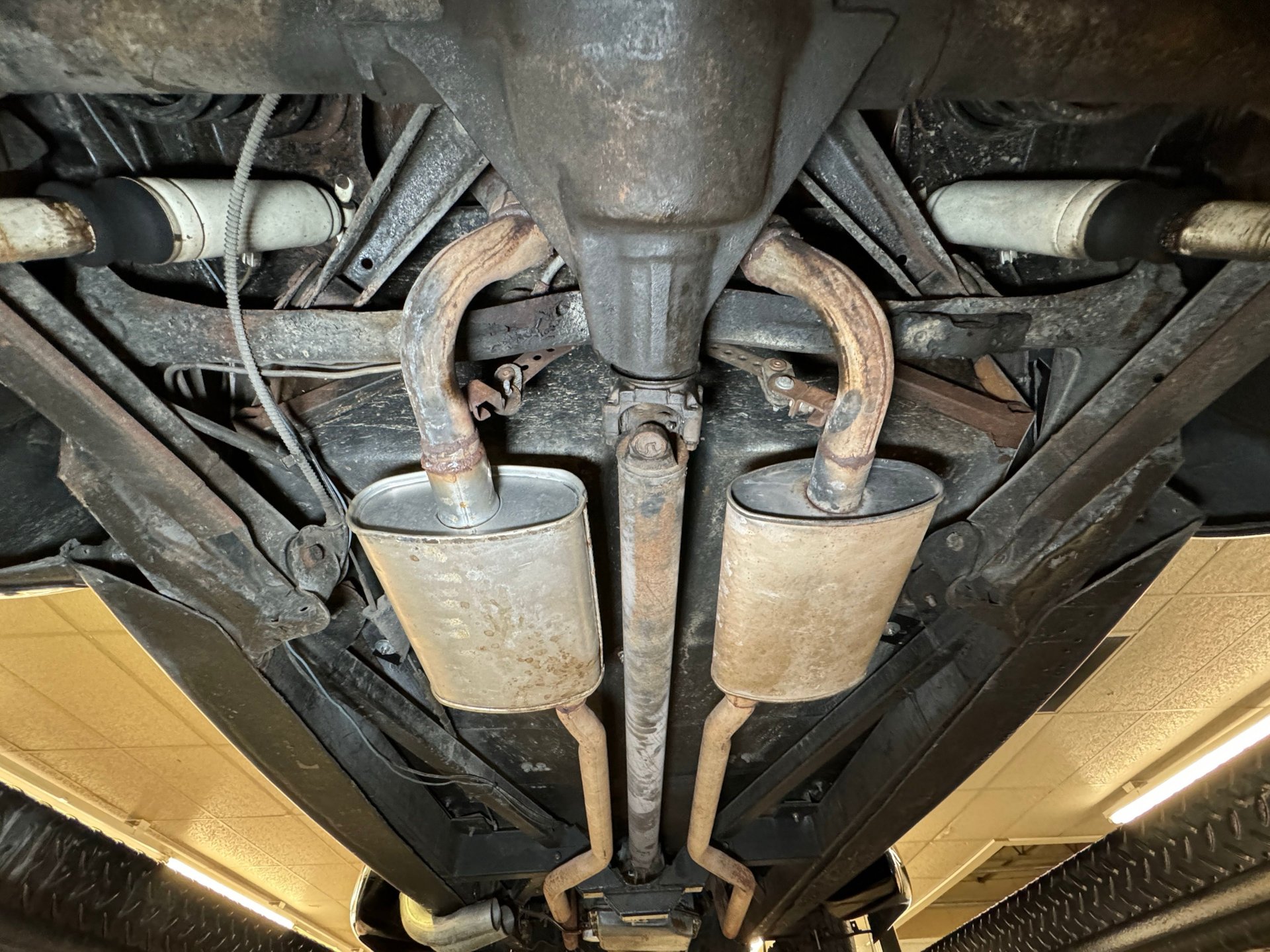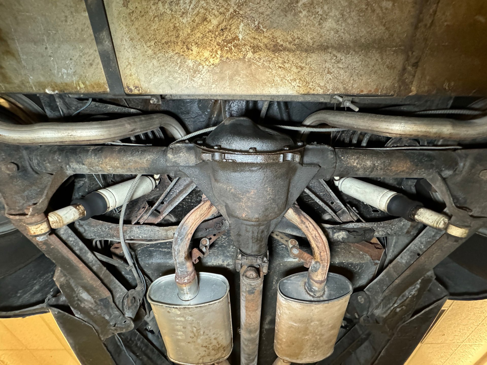 Châssis : Le dessous de caisse est également en bon état général, avec une rouille superficielle importante, des traces d'huile résiduelle et des signes d'utilisation. Le double échappement est équipé de silencieux d'origine et sort à l'arrière, comme indiqué précédemment. La suspension avant est indépendante et à ressorts hélicoïdaux, tandis que la suspension arrière est à quatre bras et à ressorts hélicoïdaux.