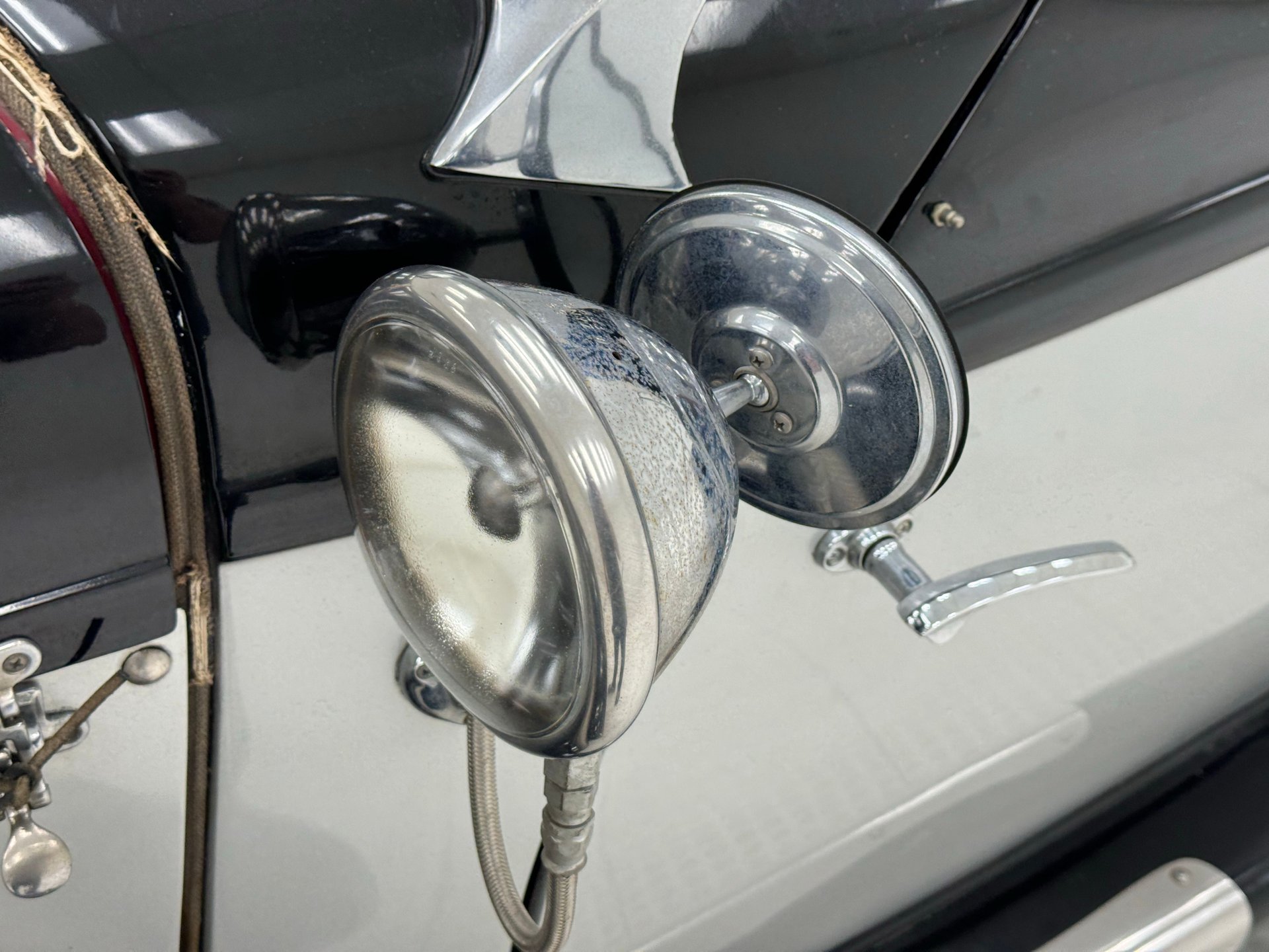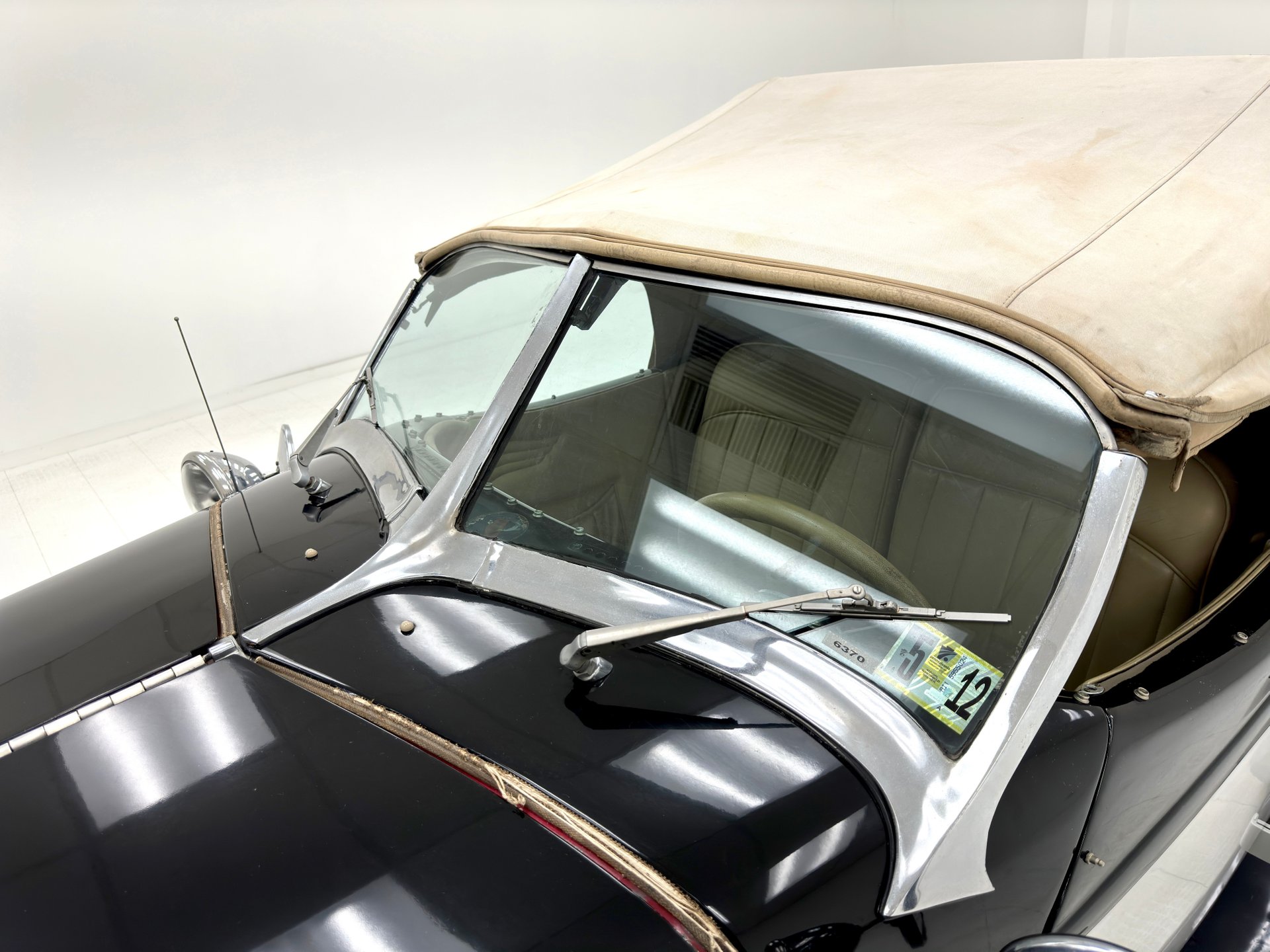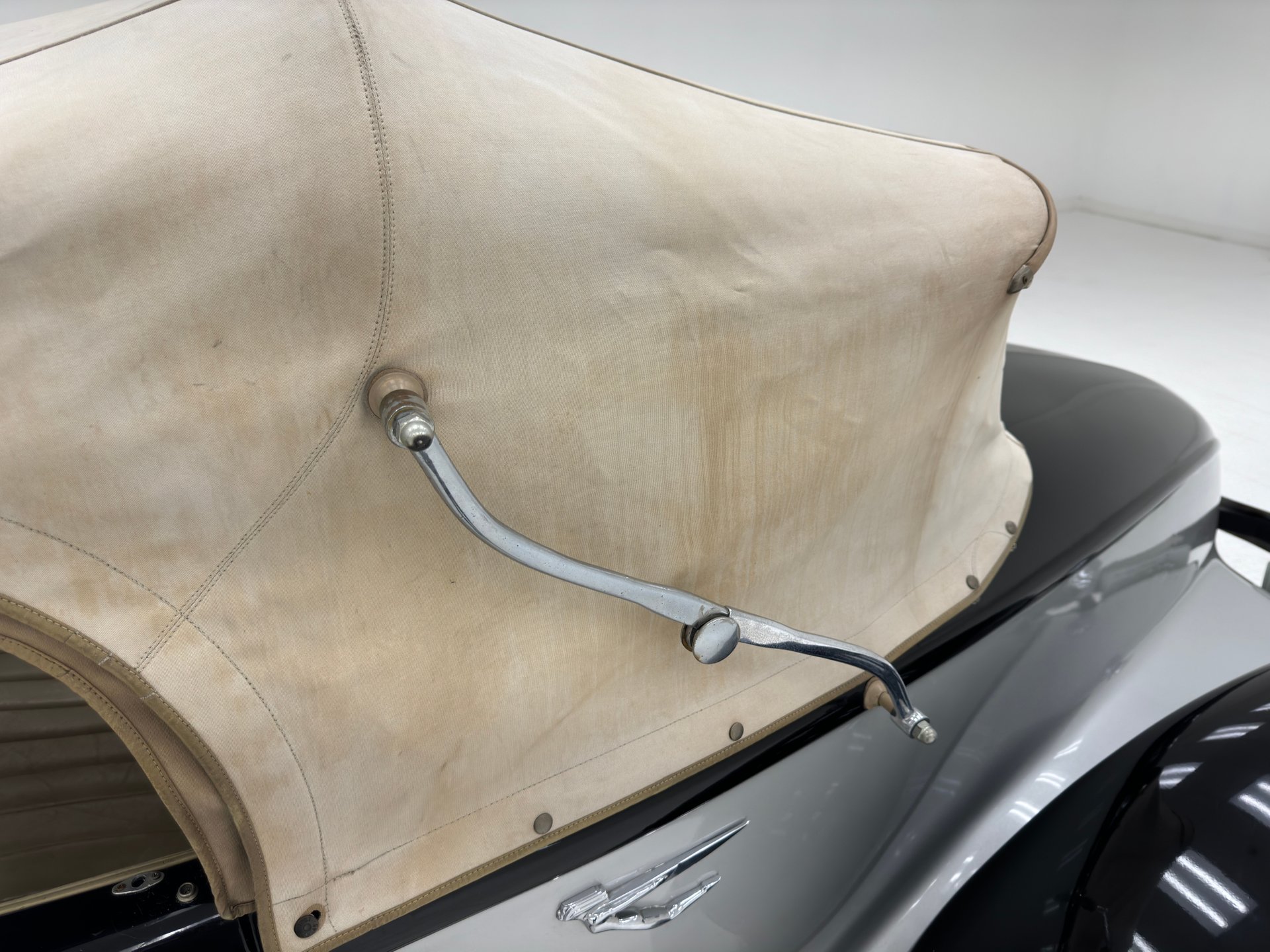 Peinte en deux tons noir et argent pour un look classique rehaussé d'éléments chromés et de pièces de carrosserie uniques. Un pare-chocs avant fluide et élégant domine la voiture, intégrant des phares antibrouillard, une calandre et de grands phares tambour extérieurs. Une femme ailée orne le capot, ses vêtements semblant avoir été emportés par le vent. Les bas de caisse intègrent de longues ouïes d'aération et de fausses sorties d'échappement qui parachèvent son allure exotique. Les ailes avant et arrière sont symétriques, celles de l'arrière s'étendant loin de la carrosserie tandis que la poupe s'affine vers l'intérieur, créant des tunnels aérodynamiques qui optimisent la circulation de l'air autour de la voiture. L'arrière, particulièrement remarquable, se termine en pointe, flanqué de feux arrière ronds et, sur notre modèle, de deux larges sorties d'échappement qui dépassent du pare-chocs sculpté. Des protections de bas de caisse chromées s'harmonisent avec les marchepieds chromés et soulignent la superbe silhouette. La capote en toile ivoire, ornée de barres de landau, présente de nombreuses tâches mais une fois nettoyée, serait en harmonie avec les larges pneus à flancs blancs montés sur des jantes à rayons de 15 pouces. On note également quelques rayures et éraflures éparses, de la peinture écaillée et quelques irrégularités au niveau des joints.