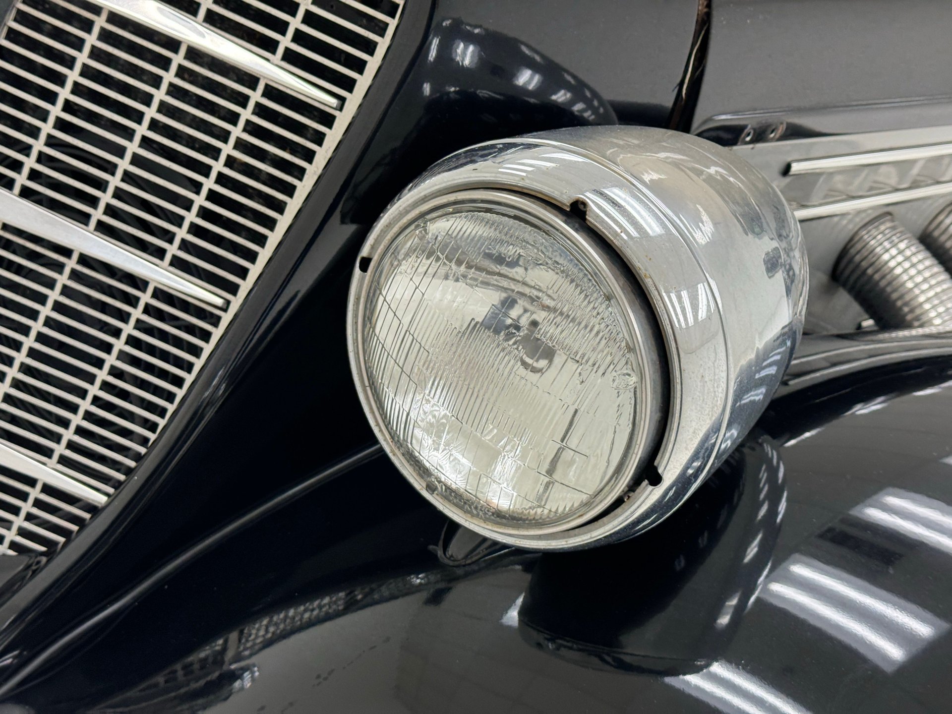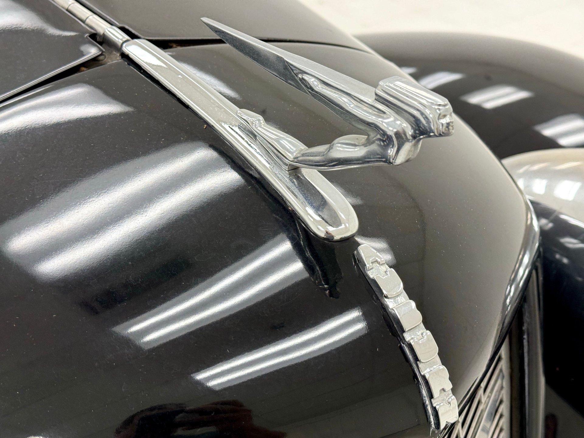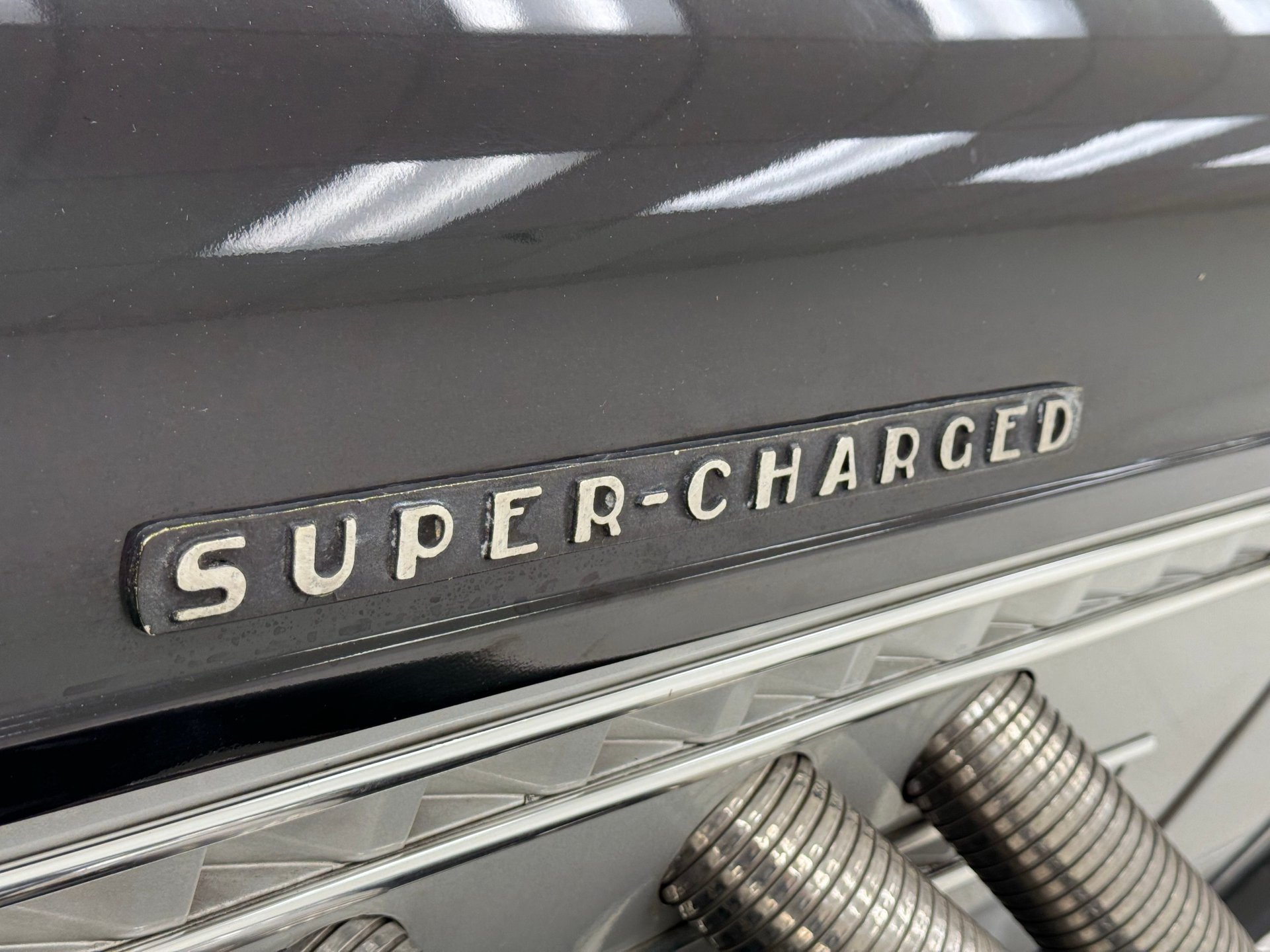 Peinte en deux tons noir et argent pour un look classique rehaussé d'éléments chromés et de pièces de carrosserie uniques. Un pare-chocs avant fluide et élégant domine la voiture, intégrant des phares antibrouillard, une calandre et de grands phares tambour extérieurs. Une femme ailée orne le capot, ses vêtements semblant avoir été emportés par le vent. Les bas de caisse intègrent de longues ouïes d'aération et de fausses sorties d'échappement qui parachèvent son allure exotique. Les ailes avant et arrière sont symétriques, celles de l'arrière s'étendant loin de la carrosserie tandis que la poupe s'affine vers l'intérieur, créant des tunnels aérodynamiques qui optimisent la circulation de l'air autour de la voiture. L'arrière, particulièrement remarquable, se termine en pointe, flanqué de feux arrière ronds et, sur notre modèle, de deux larges sorties d'échappement qui dépassent du pare-chocs sculpté. Des protections de bas de caisse chromées s'harmonisent avec les marchepieds chromés et soulignent la superbe silhouette. La capote en toile ivoire, ornée de barres de landau, présente de nombreuses tâches mais une fois nettoyée, serait en harmonie avec les larges pneus à flancs blancs montés sur des jantes à rayons de 15 pouces. On note également quelques rayures et éraflures éparses, de la peinture écaillée et quelques irrégularités au niveau des joints.